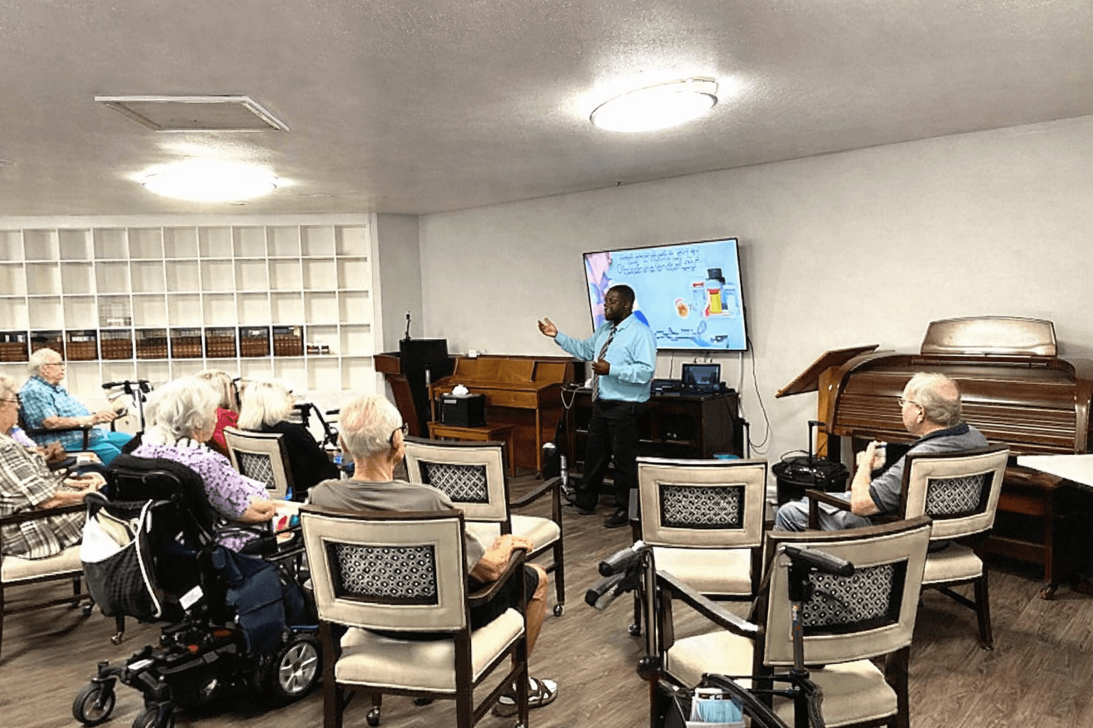 Rollin leads an engaging educational session for seniors, sharing important health information in a comfortable and supportive community setting. Attendees listen attentively as they learn about wellness and better care practices.